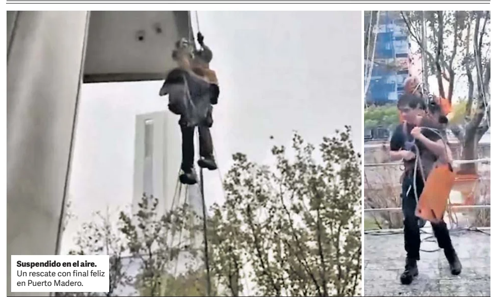 El episodio más crítico se vivió en Puerto Madero, donde un limpiavidrios de 31 años quedó colgado en el aire tras enredarse con las cuerdas de su equipo mientras trabajaba en altura. El hombre fue rescatado por bomberos en un operativo que terminó sin heridos.